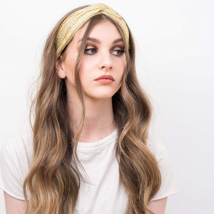 A glittery gold coloured elastic headband, featuring a stylish knot detail on the top, in the centre.